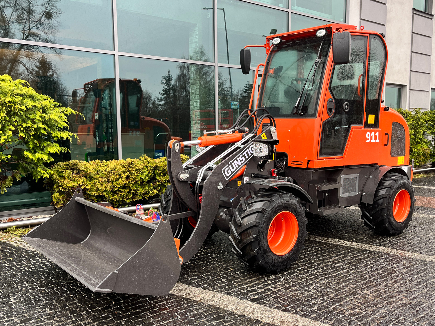Przegubowa ładowarka kołowa, swoje zastosowanie znajdzie w gospodarstwie rolnym lub składzie budowlanym.